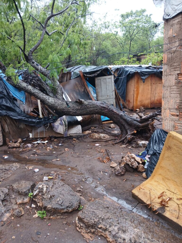 A queda ocorreu em decorrência da forte chuva acompanhada de ventos intensos que atingiu a cidade. O impacto causou danos significativos à estrutura do imóvel, resultando na destruição total do telhado de zinco, vigas e caibros, além de afetar as paredes de madeira.