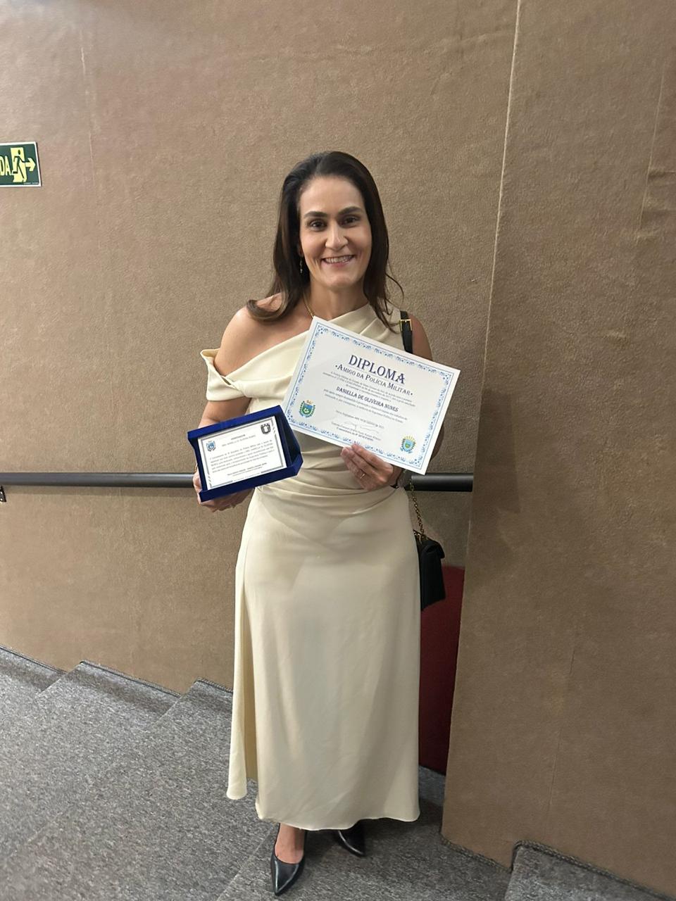 A Delegada de Polícia Civil Daniella Oliveira Nunes, titular da Delegacia de Atendimento à Mulher (DAM) de Nova Andradina, foi homenageada pela Polícia Militar com o Diploma “Amigo da Polícia Militar” e uma placa de reconhecimento entregue pelo Comando do 8º Batalhão de Polícia Militar, em solenidade realizada hoje (16), em Nova Andradina.