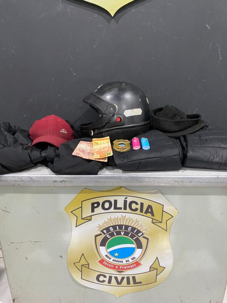 A Polícia Militar foi acionada e confirmou a veracidade dos fatos, confeccionando o boletim de ocorrência. As informações foram imediatamente repassadas à Polícia Civil, que iniciou diligências por meio da equipe da Seção de Investigações Gerais (SIG). Com base nas imagens das câmeras de segurança, os investigadores identificaram a motocicleta utilizada no crime e reconheceram como um dos autores. O suspeito já era conhecido da polícia e cumpria pena por roubo, monitorado por tornozeleira eletrônica.