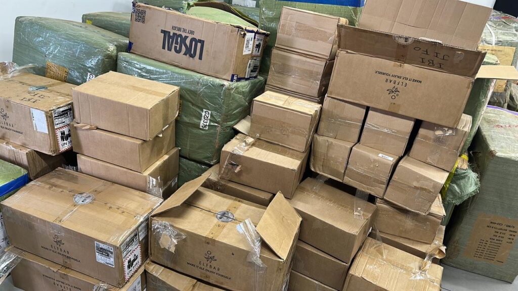 No total a Polícia Civil apreendeu 105 fardos, sendo 26 fardos de cigarro eletrônico, e os demais de vários produtos, inclusive cigarro paraguaio da marca FOX.