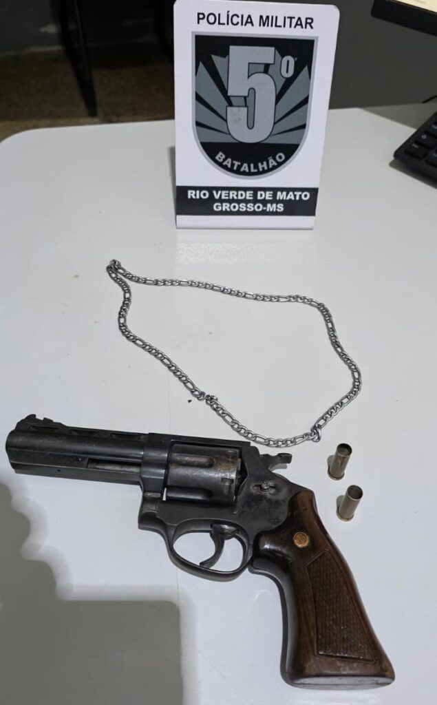 No local, a equipe constatou a veracidade da informação e encontrou um revólver calibre 38 marca ROSSI, contendo dois estojos deflagrados, o que indica possível uso recente. Próximo ao armamento, também foi localizada uma corrente masculina.