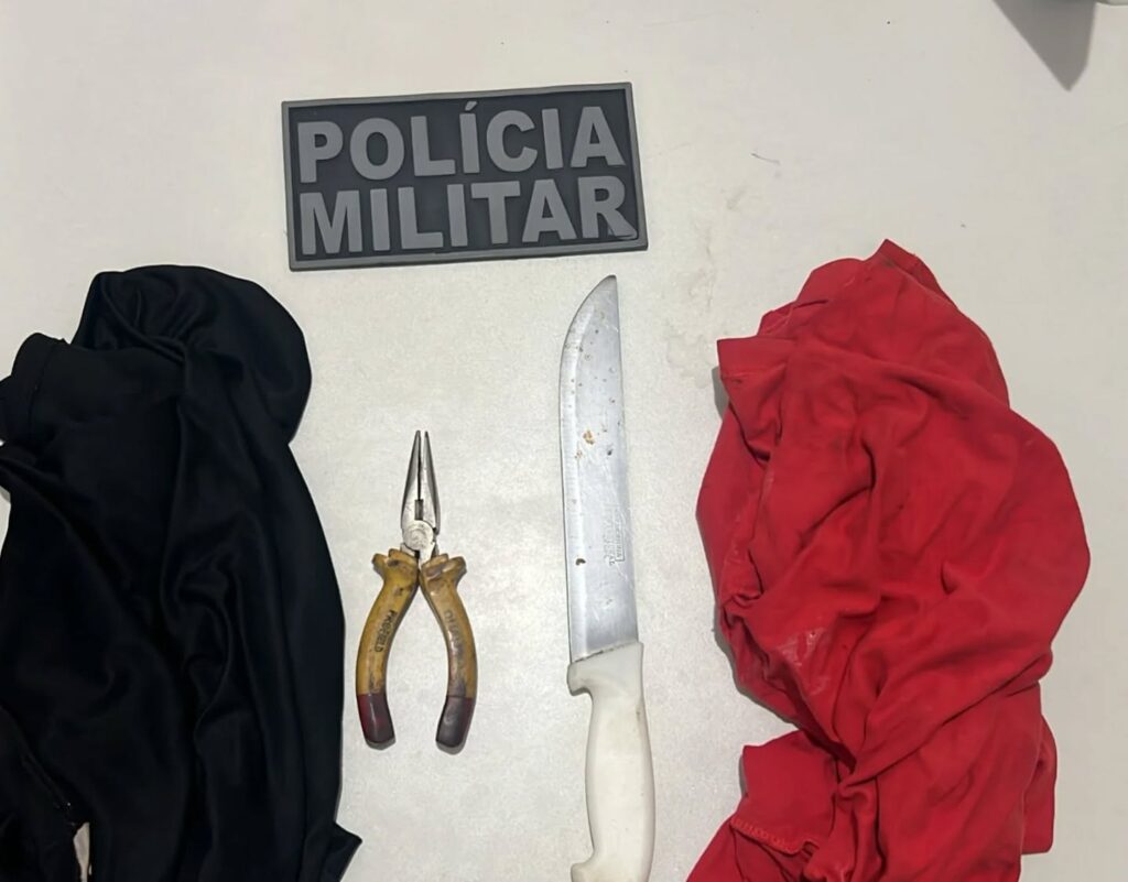 Na abordagem policial, após busca pessoal, foram apreendidos uma faca com aproximadamente 20 centímetros de lâmina e um alicate. Em ato contínuo, outra vítima relatou que os mesmos indivíduos haviam tentado abrir um veículo estacionado na via e, posteriormente, anunciaram o roubo sob grave ameaça, com uso da faca, seguido de tentativa de invasão a um imóvel, mediante chutes e socos contra a porta e uma janela, sem êxito.