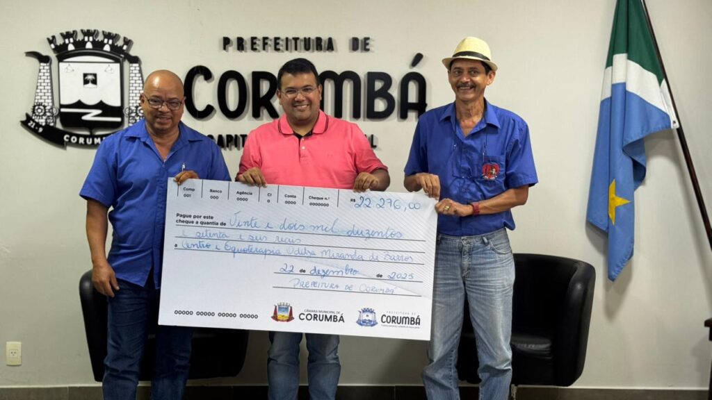 A Prefeitura de Corumbá repassou R$ 22.276,00 ao Centro de Equoterapia Odilza Miranda de Barros, recurso destinado à aquisição de materiais de consumo e à melhoria do ambiente de atendimento às crianças assistidas pela instituição. O valor é proveniente de emenda impositiva apresentada pelo vereador Chicão Vianna, atualmente titular da Secretaria Municipal de Desenvolvimento Econômico e Sustentável. A entrega ocorreu na manhã desta segunda-feira, 22 de dezembro, no gabinete do prefeito.